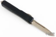 This Ultratech OTF automatic features a bronzed drop point blade with a standard edge and a black anodized aluminum handle. Matching stainless steel clip, titanium hardware, and glass breaker. Serial number 226162 and dated 11/2021. Comes with original box and papers. Has a couple light scuffs, otherwise Excellent condition.