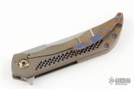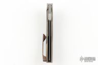 This Phantom by Merriken Knives features a satin finished blade with notched thumbrest and flipper. The handle has an acid/tumbled and anodized titanium frame with orange peel finished edges, Timascus backspacer, and tip up clip with hidden screws. Comes with original hard case, tools and COA dated 11-22-19.