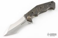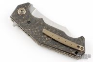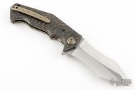 This Serpent Flipper by Randy Doucette features a satin finished spear point blade with false top edge and flipper tab. The handle has carbon fiber scales, anodized pivot collars, titanium liners with jeweled interiors, matching anodized titanium tip up clip. Nice action, detent, and blade seating. Includes a padded zippered case. Excellent Condition.