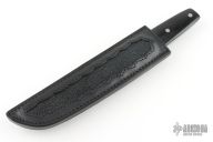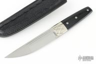 This Konjo II features a high polish "long sword point" VG-1 San Mai blade with false top edge, 1/8" blade stock, 1 1/8" blade depth. Full tapered tang construction with nickel silver dovetailed bolsters and polished black micarta handle. Includes black leather sheath and original box. Discontinued model. Has some light scratches, and patina on the bolsters, otherwise excellent condition.