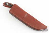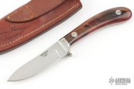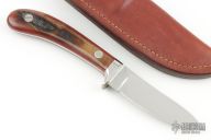 This Small Skinner by the late George Herron features a mirror polished upswept blade, .123" blade stock, .699" blade depth, full tapered tang construction. The handle has a nickel silver guard and kudu horn scales with red liners. Comes with leather belt sheath. Has some patina, excellent condition otherwise.
