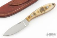 This Knife by George Herron features a mirror polished blade with .118" blade stock and .814" blade depth, full tapered tang construction. The handle has sheep's horn with stainless steel pins and red liners. Comes with a brown leather sheath. Has #2772 on the sheath. Has some light staining on the blade and some patina. Great condition otherwise.