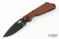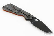 This SNG framelock folder by Mick Strider features a black drop point blade and a dimple pattern orange/black G-10 and flamed titanium frame and tip up titanium clip. Includes a "Lock Bar Stabilizer" for maximum reverse lock retention. Nice detent, lockup and blade seating. Excellent condition.