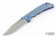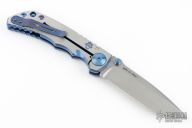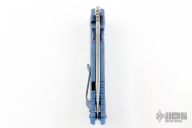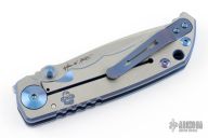 This framelock folder by Spartan Blades features a stonewashed drop point blade with dual thumbstuds and a notched thumbrest. The handle has a two tone satin/anodized finished frag milled titanium frame with tip up titanium clip. Has nice detent, lockup, and blade seating. Comes with original box and papers. Excellent condition.