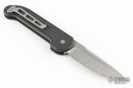 This LUDT by Microtech features a Damascus blade. The handle is black aluminum with a tip up, right or left, stainless steel clip. Has been used and resharpened. Has scuffs and scratches. Dated 06/2001. Fair condition, or good user condition.