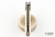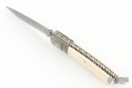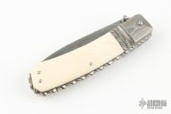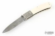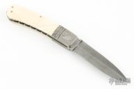 This lockback by Barry Davis features a drop point Damascus blade with false top edge, fileworked spine, Damascus thumbstud with a stainless pin. The handle has fluted and fileworked Damascus bolsters, fluted mammoth ivory scales, domed pins, fileworked nickel silver liners, fileworked stainless steel lockbar and backspacer. Nice lockup and blade seating, very smooth. Excellent condition.