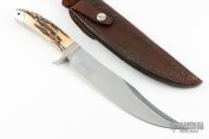 This Bowie from Herb Whitmore features an upswept mirror polished blade with false top edge. The handle is comprised of nickel silver guard and pommel with stag handle over full tang construction with stag covers and lanyard hole. Comes with brown leather belt sheath. Has some scuffs and patina, excellent condition otherwise. .194" blade stock 1.396" blade depth.