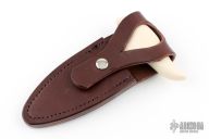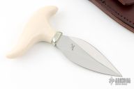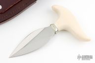 This Push Dagger by Larry C. Mensch features a mirror finished double-edged blade with .176" blade stock and 1.34" blade depth, hidden tang construction. The handle has a imitation ivory grip with nickel silver guard. Comes with a brown leather sheath. Excellent condition.