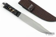 This knife by ITAC features a hand rub satin finished blade with nice hamon, .236" blade stock and 1.198" blade depth, full tang construction with leather wrapped handle over leather and nickel silver menuki. Comes with a leather covered kydex sheath and zippered case. Excellent condition.