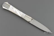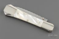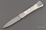 This lockback folder by Mel Pardue features a hand rub satin finished blade. The handle has nickel silver bolsters, front and rear, mother-of-pearl scales, nickel silver liners, stainless steel backspacer. Nice lockup and blade seating. #123 on blade. Excellent Condition.