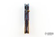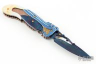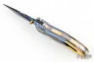 This knife by Suchat Jangtanong features a carved and blued Damascus blade with a single diamond inlaid thumbstud. The handle has carved and blued Damascus bolsters, gold lip pearl scales, fileworked and anodized titanium liners, gold-plated screws.  Nice detent and lockup. Excellent condition.