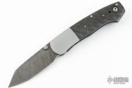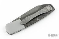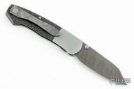 This Scott Sawby Combat Utility folder has his patented self lock system. The blade is Damascus with dual knurled thumbstuds. The handle has dovetailed bead blast finished stainless steel bolsters with integral liners, carbon fiber scales, tip up Damascus clip and backspacer, clip is left/right reversible. Excellent condition.