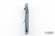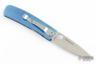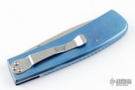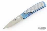 This Centofante Memory Linerlock Folder has a satin finished VG-10 stainless steel drop/ spear point blade with thumb hole. Handle is blue anodized titanium with A-side twill G10 scale, blue titanium liners, filed blue titanium spacer, and stainless steel tip down clip. Comes with original zipper case and papers. Excellent condition.