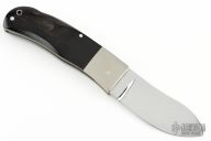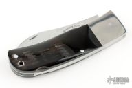 This lockback folder by Wayne Clay features a mirror polished blade with nail nick. The handle has stainless dovetail bolsters, horn scales, stainless steel spring with lanyard hole in pommel. Opens and closes with a nice snap. Nice lockup and function, very light pull/action. Has some scuffs and scratches, great condition otherwise.