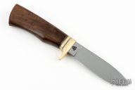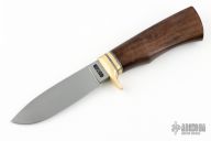 This custom knife by Journeyman Smith David Roeder features hand rubbed satin finished flat ground blade with .250" blade stock and 1.142" blade depth, hidden tang construction. The handle has a textured brass guard with a coin edged 1018 steel spacer, wood grip. New from maker.