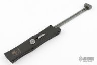 This Exodus by Microtech opens out the front via the automatic push button. Closes by disengaging the leaf lock and pulling the reverse charging handle in the rear of the frame. Contoured frame grip with milled ribbing on the frame spine and belly. This Exodus features a tanto blade. Dated 07/2001. Has a couple light scuffs/scratches, otherwise excellent condition.