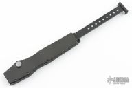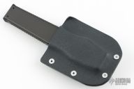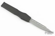 This HALO II is the clip point blade model in the HALO series by Microtech Knives. Single action, side positioned button for firing. Closure via a reverse charging handle in the rear of the frame. Contoured frame grip with milled ribbing on the frame spine and belly. This Halo II has a bead blasted clip point blade dated 10/97. Has some scuffs and scratches, otherwise excellent condition. Comes with original kydex sheath and unlabeled modern microtech box.