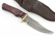 BROWN BEAR BOWIE KEY FEATURES: Magma High-Carbon Damascus Steel | Dyed and Stabilized Redwood Burl Crotch | Brass Guard | Resin and G10 Spacers | Custom-Hand Stamped, Wet-Formed, Dyed Leather Sheath