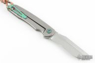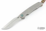 This Matanzas from Nick Swan Knives features a tumble finished recurve harpoon style blade with elongated swedge. The handle is comprised of stonewashed titanium with anodized titanium pivot, matching tip up clip, titanium barrel spacers and blackened titanium pivot collar. Rides on bearings, nice detent, lockup and blade seating. Has some light scratches, has a little lockstick, appears to have been resharpened, good condition otherwise.