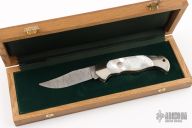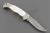 This lockback folder by Boker features a Damascus blade. The handle has nickel silver frame, mother of pear inlays, and a stainless steel backspacer. Comes with original wood presentation box. Has a few light scratches, otherwise excellent condition.
