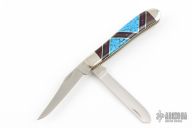 This slipjoint by Case has been given a custom handle by David Yellowhorse and is one of a limited edition of 150. Features two mirror finished blades with nail nicks. The handle has nickel silver bolsters and butt, ironwood/turquoise with nickel silver spacers, brass liners and stainless steel springs. Has half-stops. Comes with original box and papers. Excellent condition.