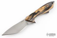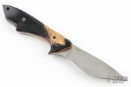 This Eli by Jerry Hossom features nicely shaped black/white ebony wood scales. Hand rubbed satin finished blade with notched thumbrest, .157" blade stock and 1.141" blade depth, full tang construction. Fits nicely in hand. Includes a zippered case.  New from maker!