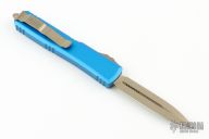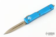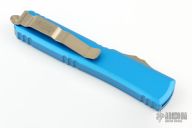 This Ultratech by Microtech features a stonewash bronzed double-edged blade with fullers. The handle has a blue aluminum frame with bronzed stainless steel hardware. Comes with original box and papers. Excellent condition. Dated 04/2022 and s/n 241157.