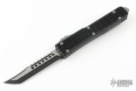 This Ultratech Hellhound by Microtech Knives features a two-tone black DLC blade with notched thumbrest and fullers, false top edge. The handle has a Tri-Grip black aluminum frame with tip down gun metal stainless steel clip, gun metal hardware, gun metal thumbslide. Comes with original box and papers. Excellent condition. Dated 06/2023 and s/n 204