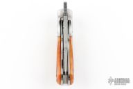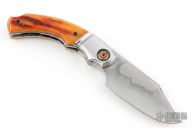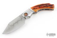 This Front Flipper by Remi Bouin features a satin finished clip point blade with a hamon and a notched thumbrest, front flipper style opening. The handle has steel bolsters, jigged bone scales over titanium liners, and a steel backspacer.  Rides on bearings, nice detent, lockup and blade seating. Includes COA.  New from maker!