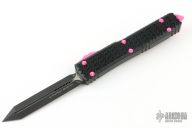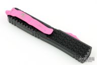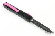 This Ultratech Hellhound by Microtech Knives features a black DLC Spartan blade with notched thumbrest and fullers, false top edge. The handle has a Tri-Grip black aluminum frame with tip down pink stainless steel clip, pink hardware, pink thumbslide. Comes with original box and papers. Excellent condition. Dated 02/2023 and s/n 357