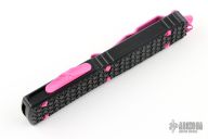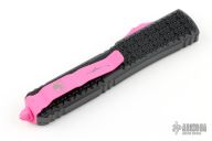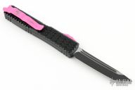 This Ultratech Hellhound by Microtech Knives features a black two-tone DLC tanto blade with notched thumbrest and fullers, false top edge. The handle has a Tri-Grip black aluminum frame with tip down pink stainless steel clip, pink hardware, pink thumbslide. Comes with original box and papers. Excellent condition. Dated 11/2022 and s/n 290