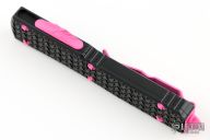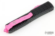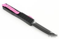 This Ultratech Hellhound by Microtech Knives features a black two-tone DLC tanto blade with notched thumbrest and fullers, false top edge. The handle has a Tri-Grip black aluminum frame with tip down pink stainless steel clip, pink hardware, pink thumbslide. Comes with original box and papers. Excellent condition. Dated 11/2022 and s/n 297