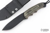 This Cochise from Tops Knives features a black coated drop point blade with swedge and notched thumbrest, .196" blade stock and 1.305" blade depth, full tang construction. The handle has black linen micarta scales over red liners. Includes kydex sheath with belt clip. Excellent condition.