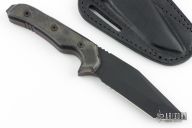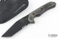 A special mission expert officer Allen Garcia has been a police officer in Middletown, RI since 1988. Prior to that, he served as a Sergeant in the US Army's 82nd airborne division. He has been assigned to both departments a regionalized SWAT teams since 1991 and a member of the NTOA (National Tactical Officers Assoc.) and IALEFI. Portions of his testing and review included: The cutting edge features three deep serrated cutting surfaces at its base which, combined with its razor sharp, dual grind, Tanto blade give it excellent cutting capabilities. The handle is configured to allow for a very secure grip. I found that the traction I could attain when gripping the knife in a standard hammer type grip was absolutely outstanding. Once you get this knife in your hand it is, for the most part, there to stay. Kydex belt sheath is void of any retaining devices but, is molded to the knife and provides an excellent retention and flash fast drawing capabilities. It is nimble and easy to manipulate. I drove the knife through the tops of 55 gallon drums with nothing more then cosmetic damage. I liked this knife and found no obvious flaws with its design. This is an excellent knife for the police officer or soldier that is looking for a super tough, dependable knife that is not overly large or cumbersome. ...SPECIAL OPS TRUST TOPS... 'CAUSE THEY'RE HARD TO THE CORE! Comes with a custom TOPS black leather sheath. Excellent condition.
