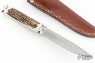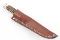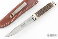 This boot knife by Kershaw features a high polished blade with false top edge, .119" blade stock and .661" blade depth at the ricasso, integral construction. The handle has integral bolsters, front and rear with stag scales. Comes with a brown leather boot sheath. Has a few light scratches, otherwise excellent condition.