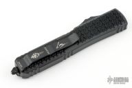 This Ultratech Hellhound by Microtech Knives features a two-tone black DLC blade with notched thumbrest and fullers, false top edge. The handle has a Tri-Grip black aluminum frame with tip down black stainless steel clip, black hardware, black thumbslide. Comes with original box and papers. Excellent condition. Dated 05/2023 and s/n 053
