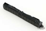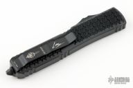 This Ultratech Hellhound by Microtech Knives features a two-tone black DLC blade with notched thumbrest and fullers, false top edge. The handle has a Tri-Grip black aluminum frame with tip down black stainless steel clip, black hardware, black thumbslide. Comes with original box and papers. Excellent condition. Dated 06/2023 and s/n 173