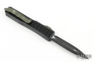 This Ultratech Hellhound by Microtech Knives features a black two-tone DLC dagger blade with notched thumbrest and fullers, false top edge. The handle has a Tri-Grip black aluminum frame with tip down green stainless steel clip, green hardware, green thumbslide. Comes with original box and papers. Excellent condition. Dated 12/2022 and s/n 027
