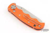 This Spyderco Autonomy features a satin finished fully serrated blade, H-1 Blade steel. The handle has orange G-10 scales, stainless steel liners, and a tip up reversible clip. Excellent condition. Factory Second