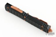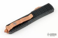 This Ultratech OTF automatic by Microtech features a D/E blade with a standard edge. Copper button, hardware, and clip. Glass breaker. Black TriGrip aluminum handle with glass breaker. Dated 12/2022 and serial number 380. Excellent condition. Comes with original box and papers.
