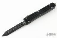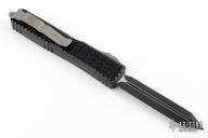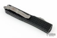 This Ultratech Hellhound by Microtech Knives features a two-tone black Spartan DLC blade with notched thumbrest and fullers, false top edge. The handle has a Tri-Grip black aluminum frame with tip down gun metal stainless steel clip, gun metal hardware, gun metal thumbslide. Comes with original box and papers. Excellent condition. Dated 02/2023 and s/n 218