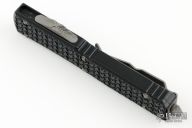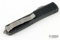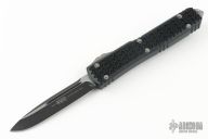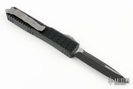 This Ultratech Hellhound by Microtech Knives features a two-tone black s/e DLC blade with notched thumbrest and fullers, false top edge. The handle has a Tri-Grip black aluminum frame with tip down gun metal stainless steel clip, gun metal hardware, gun metal thumbslide. Comes with original box and papers. Excellent condition. Dated 01/2023 and s/n 173