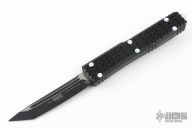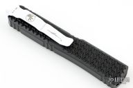 This Ultratech Hellhound by Microtech Knives features a black two-tone DLC tanto blade with notched thumbrest and fullers, false top edge. The handle has a Tri-Grip black aluminum frame with tip down white stainless steel clip, white hardware, white thumbslide. Comes with original box and papers. Excellent condition. Dated 03/2023 and s/n 163