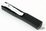 This Ultratech Hellhound by Microtech Knives features a black two-tone DLC s/e blade with notched thumbrest and fullers, false top edge. The handle has a Tri-Grip black aluminum frame with tip down white stainless steel clip, white hardware, white thumbslide. Comes with original box and papers. Excellent condition. Dated 03/2023 and s/n 141