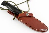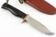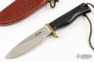 The Model 28 by Randall Made Knives is an excellent skinning and outdoors knife. Has a satin finished drop point blade with false top edge and notched thumbrest, stainless steel blade, .157" blade stock and 1.161" blade depth, full tang construction. The handle has a brass guard, black linen micarta handle and a lanyard hole at the butt. Comes with brown leather sheath. Excellent condition.