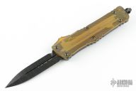 This Combat Troodon OTF automatic features a DLC D/E Damascus blade with a standard edge. Ultem Top and button, stainless steel clip, tip down carry. Glass breaker. Comes with original box and papers. Excellent Condition. S/N 012 Dated 08/2023.