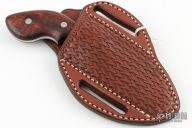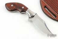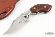 This Pistol Grip Push Bowie from Knife Makers Guild President Todd Begg features a hand rub satin finished blade with false top edge, .211" blade stock and 1.177" blade depth, full tapered tang construction. The handle has 416SS bolsters, Tasmanian Blackwood scales. Comes with a hand tooled brown leather sheath, COA dated July 2019, and a zippered case. Excellent condition. The COA says this is based on a Tom Krein design.