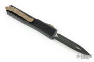 This Ultratech Hellhound by Microtech Knives features a two-tone D/E black DLC blade with notched thumbrest and fullers, false top edge. The handle has a Tri-Grip black aluminum frame with tip down FDE Tan stainless steel clip, FDE Tan hardware, FDE Tan thumbslide. Comes with original box and papers. Excellent condition. Dated 01/2023 and s/n 065