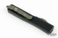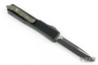 This Ultratech Hellhound by Microtech Knives features a two-tone S/E black DLC blade with notched thumbrest and fullers, false top edge. The handle has a Tri-Grip black aluminum frame with tip down OD Green stainless steel clip, OD Green hardware, OD Green thumbslide. Comes with original box and papers. Excellent condition. Dated 01/2023 and s/n 217
