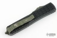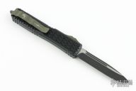This Ultratech Hellhound by Microtech Knives features a two-tone S/E black DLC blade with notched thumbrest and fullers, false top edge. The handle has a Tri-Grip black aluminum frame with tip down OD Green stainless steel clip, OD Green hardware, OD Green thumbslide. Comes with original box and papers. Excellent condition. Dated 01/2023 and s/n 233